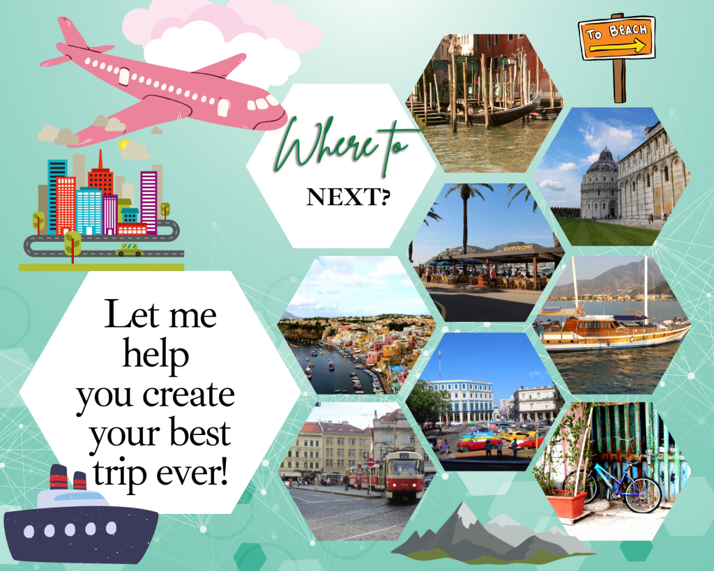 Are you wondering where you should go on your next vacation? What you should see there? How you should get there? Do you need a passport? What about traveling with groups? Should you purchase travel Insurance? These linked pages will help you with some of that information, but remember you can always email, text or call me.