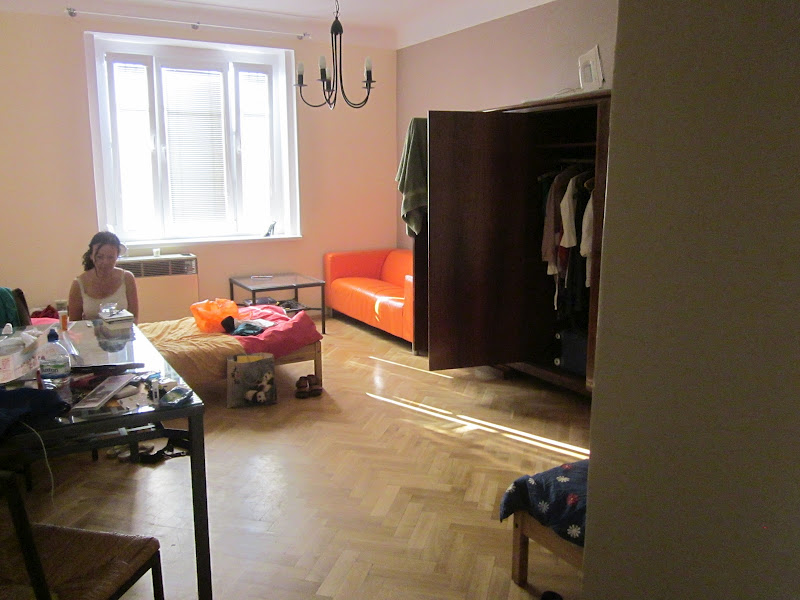 In other words a room with 2 twin beds, a wardrobe (for all three of us to share), a couch with a coffee table and a kitchen table with 3 chairs. He was very proud of this space. He thought he had given us the keys to the single best rental in Prague. We had a large picture window and it looked over the constructions site. Lovely! (Please note the it had no shades and the sun rises VERY early in Prague in the summer). Well Neville ran off leaving us each a key to the front door and the flat itself and with the promise of wifi tomorrow, an email with the rest of the house rules and inventory of the apartment and some rather sketchy walking directions back to the school for our 10 am class in the morning all while we were following him back down stairs to get our other bags from the hall.