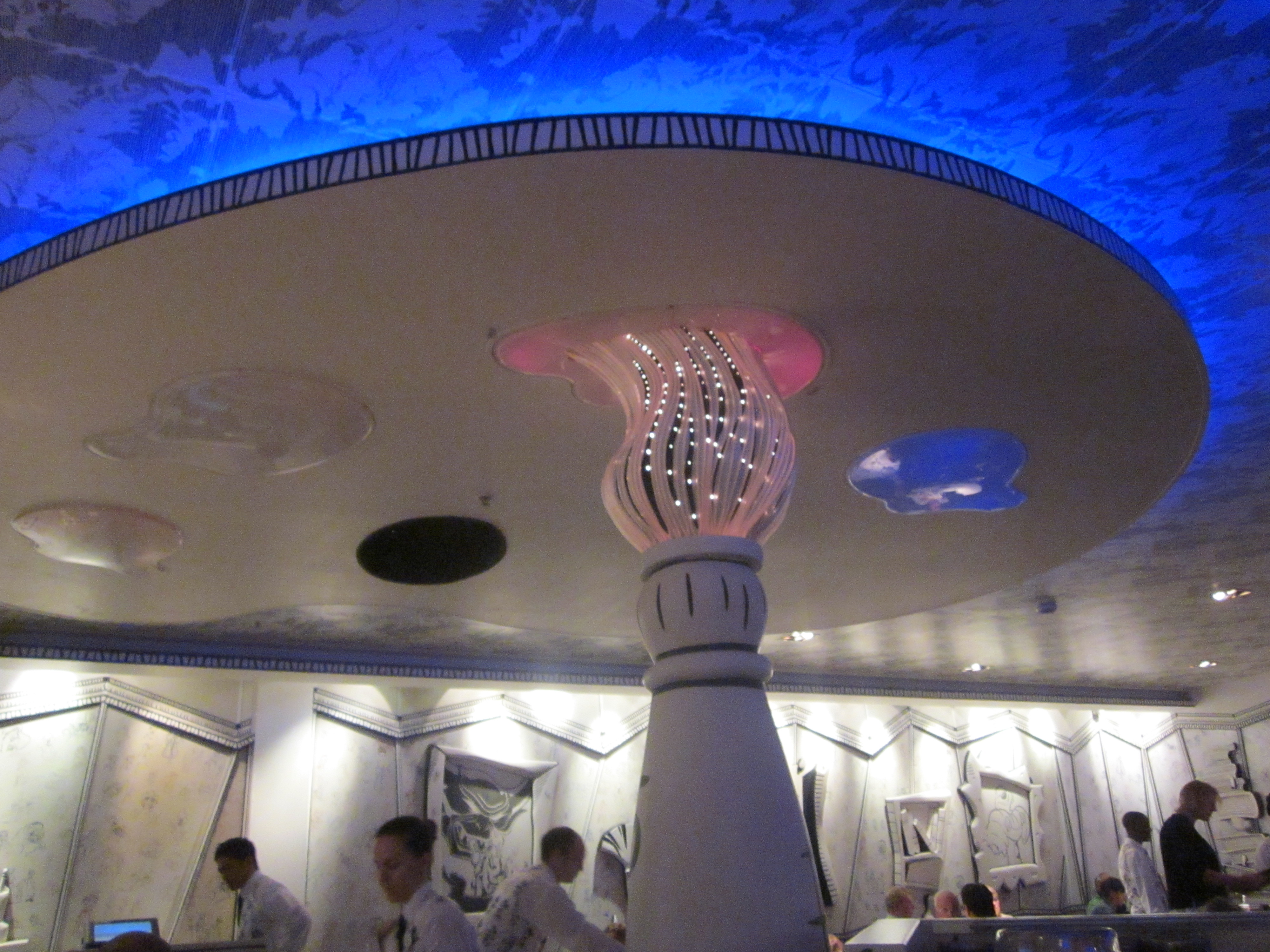 The Parrot Cay restaurant was dinner with a Caribbean flair. The parrot decor wasn’t to my taste, nor the wait staff’s uniforms filled with colorful parrots and palm trees. IT was too much like bad Hawaiian shirt night I’ve been exposed to on other cruises. But the food was good and they did a nice lunch seafood buffet in this restaurant too. Triton’s Restaurant was the most elegant of the three. There is a large mural on the wall made entirely of mosaic stone of Ariel, Triton and their Kingdom which is pretty fabulous. The food here was more typical cruise dinner food than at the Parrot Cay. And the third restaurant was called the Animator’s Palett. This one was very different and quite wonderful. It was based on animation and all in black and white when you entered the dinning room. The staff wore black and white uniforms as well. But as you sat there the light show began as sections of the room (and the paintbrush light fixtures complete with palette’s) became colored. Even the uniforms on the wait staff became full color by the end of the evening. This is hard to explain though and it’s really a see it to fully believe it kind of thing.
